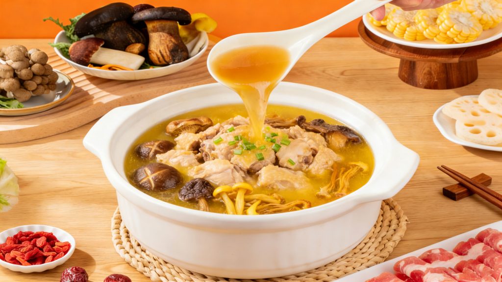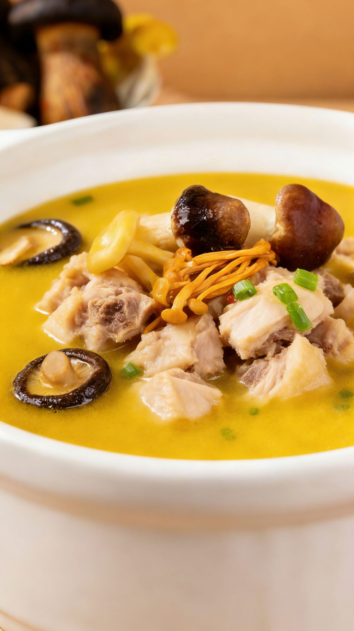 4、成品调整:尝味后适量添加食盐,搅拌均匀即可出锅,可撒少许葱花或香菜点缀,汤色金黄、菌香浓郁。