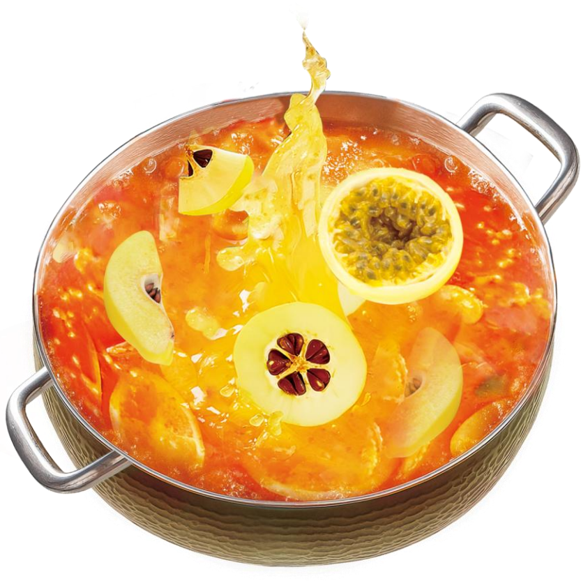 2、锅里烧水1250g,煮开后加入云南酸汤果料250g和百香果拌匀,放入树