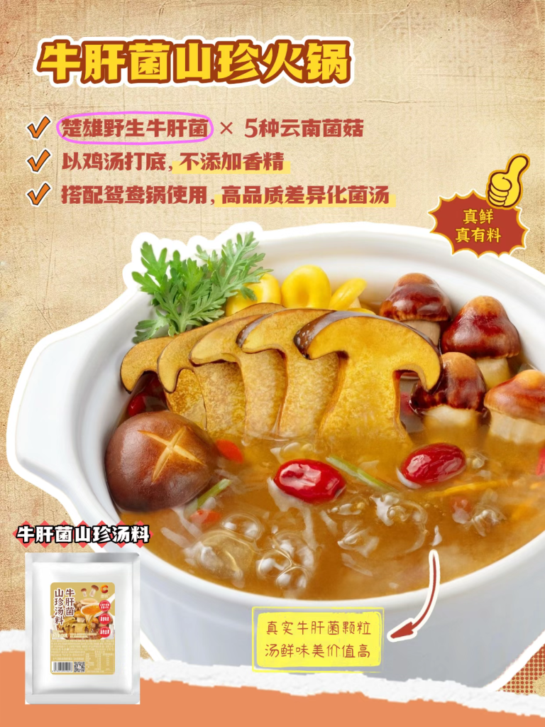 契合冬天“健康养生”趋势,牛肝菌低脂低热量,富含膳食纤维、抗氧化物质,喝出好气色。