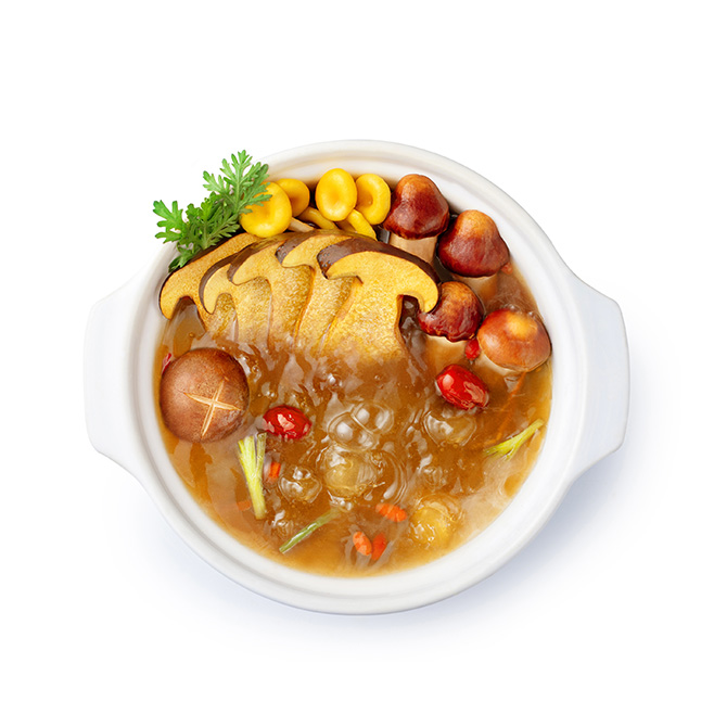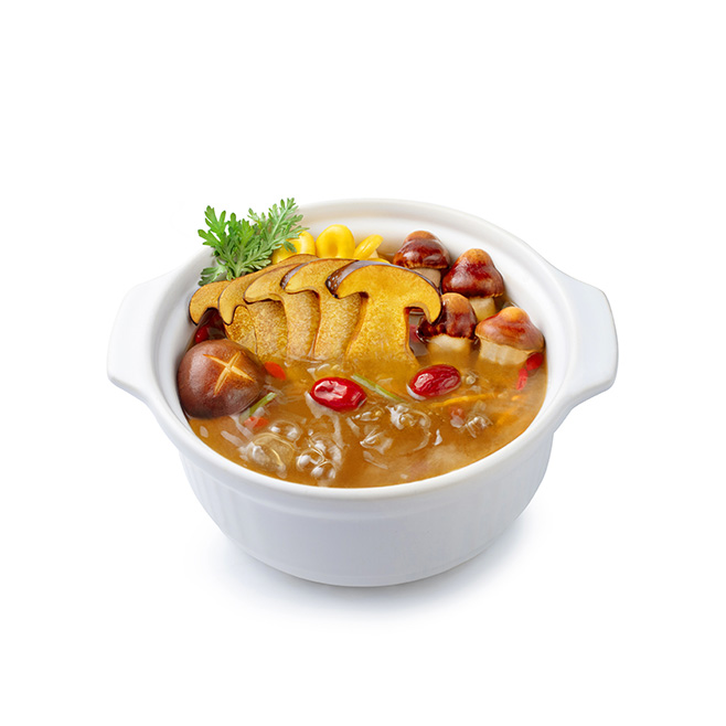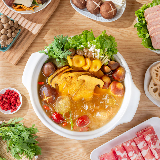 汤色呈诱人金黄色,颜值出众。打造特色差异化的有料菌汤,满足消费者拍照分享的社交需求,助力门店获得自发传播热度。