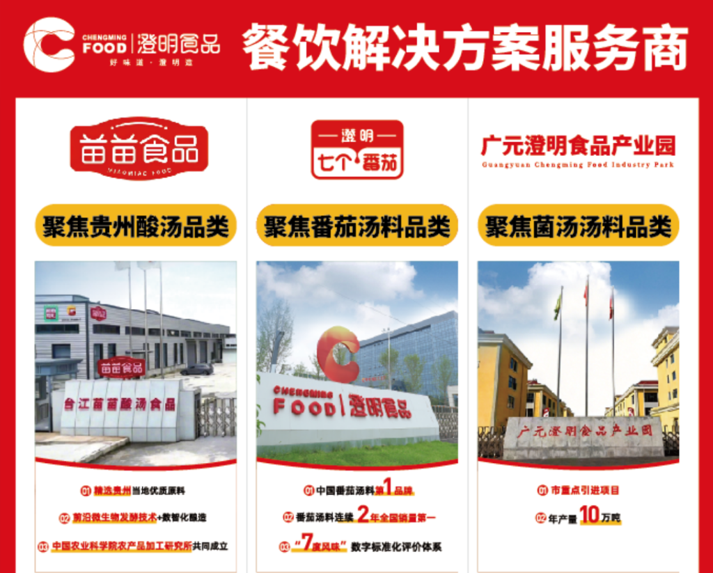 👉2026年,是大澄明品牌战略元年,澄明食品正式进入3工厂时代。河南鹿邑聚焦番茄汤料品类,四川广元聚焦菌汤汤料品类,贵州苗苗聚焦贵州酸汤品类,三大生产基地协同发力,夯实复调品类壁垒,完善全国产能布局。