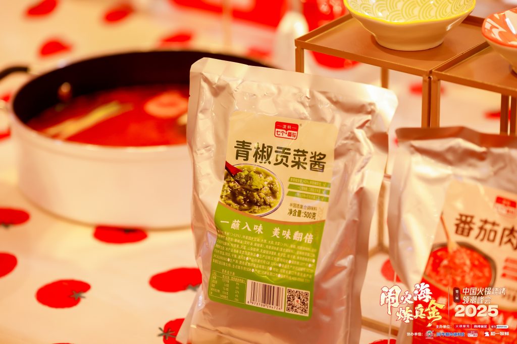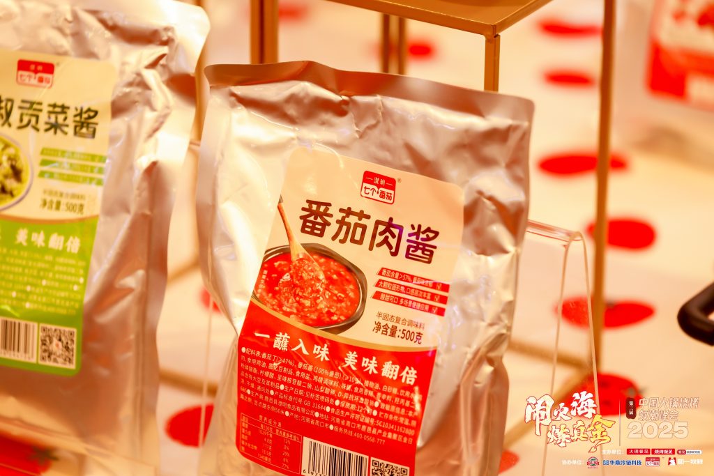 本次展会,除了七个番茄一锅汤的明星返场,还迎来了今夏红利利器“贵州风味果香酸汤”和山野风蘸酱“青椒贡菜酱”、“番茄肉酱蘸酱”的新品首秀。作为这两年的“汤底界黑马”,贵州风味果香酸汤一经推出,就受到了参展客户的瞩目。食材在滚烫的火锅里上下翻滚几番,经过地道酸汤的浸润和包裹,一口下去,酸、辣、香尽数爆发。