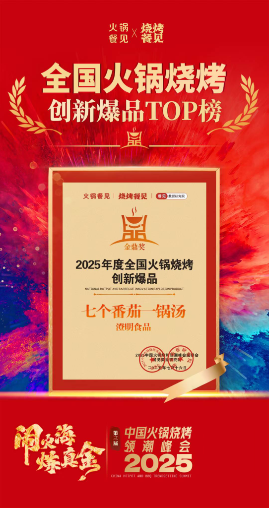 供应链端,澄明七个番茄凭借从产品研发定制到爆款菜单打造,从产品营销推广到权威媒体宣发占位的全链路服务,获得“全国火锅烧烤供应链影响力”奖。产品端,七个番茄一锅汤凭借能打的品质、过硬的口味和庞大的客群市场,获得“全国火锅烧烤创新爆品”奖。
